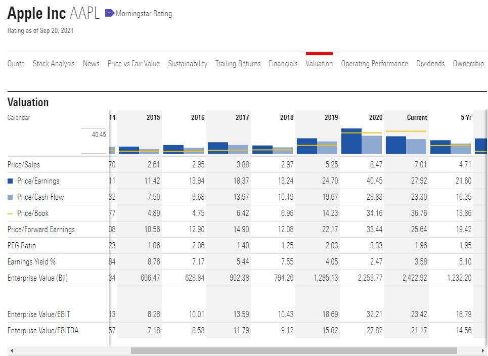 - Morningstar. Сервис подойдет для изучения подробной информации и различных мультипликаторов большинства крупных иностранных компаний. В разделе «Valuation» есть данные по Enterprise Value и мультипликаторы, основанные на EV. Приводятся данные за текущий и прошлые годы.