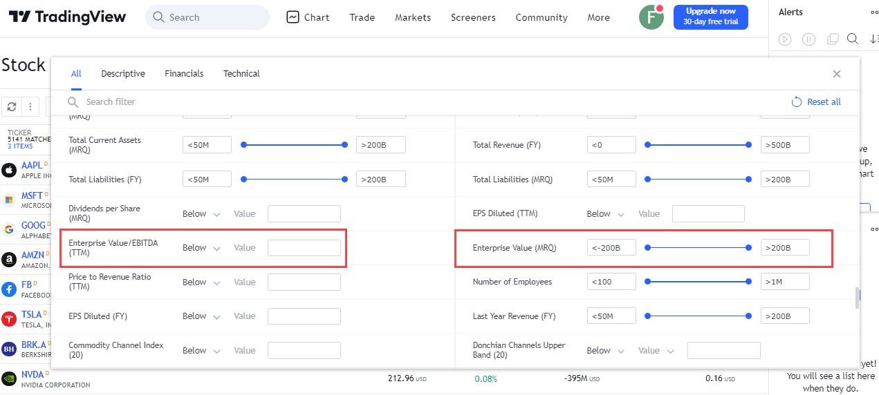 - TradingView. Этот ресурс известен не только живым графиком, но и отличным скринером. В перечне фильтров есть и EV, и мультипликаторы, использующие Enterprise Value. Удобно то, что условия фильтров можно гибко настраивать, к тому же весь функционал доступен сразу.