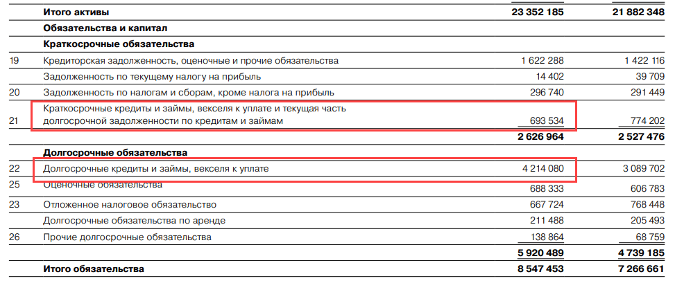 - В этом же документе находим данные по кратко- и долгосрочной задолженности. Краткосрочная задолженность составляет 693,534 млн рублей, долгосрочная – 4,214080 млрд рублей.