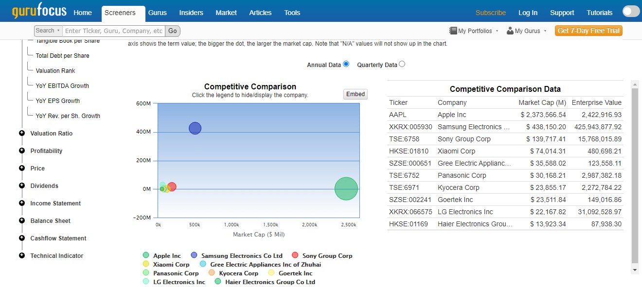 - Gurufocus. Это лучший сервис для работы с мультипликаторами и различной статистикой. Здесь есть и все нужные мультипликаторы, и сравнение с конкурентами, и графическое отображение этих данных. Чтобы получить доступ ко всем возможностям сервиса придется купить платный доступ.