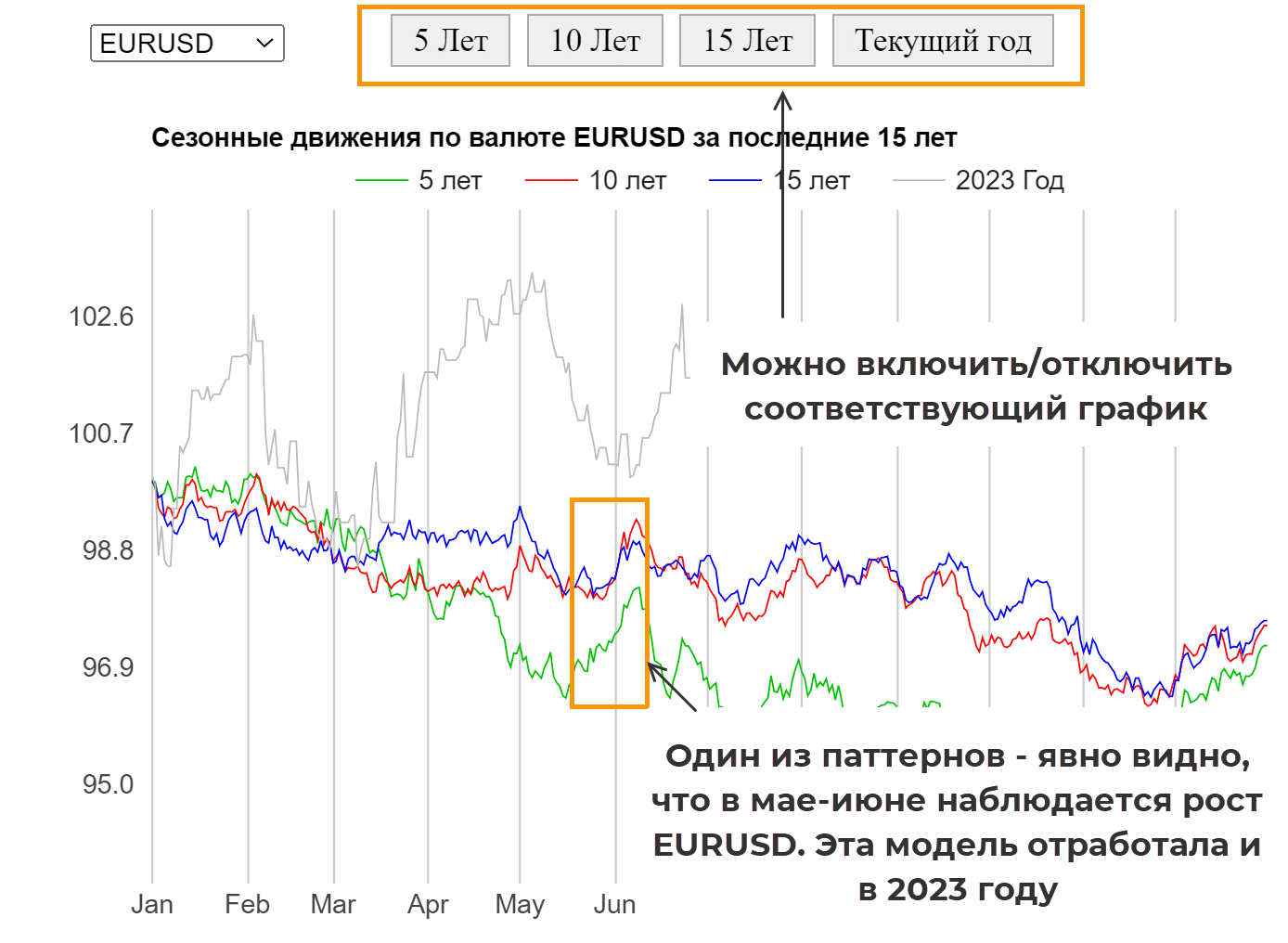 - Есть графическое отображение «сезонного тренда». На графике показано усредненное поведение графика актива в течение года. Пользователь сам задает временной диапазон для оценки. На графике можно выделять характерные особенности движения актива.