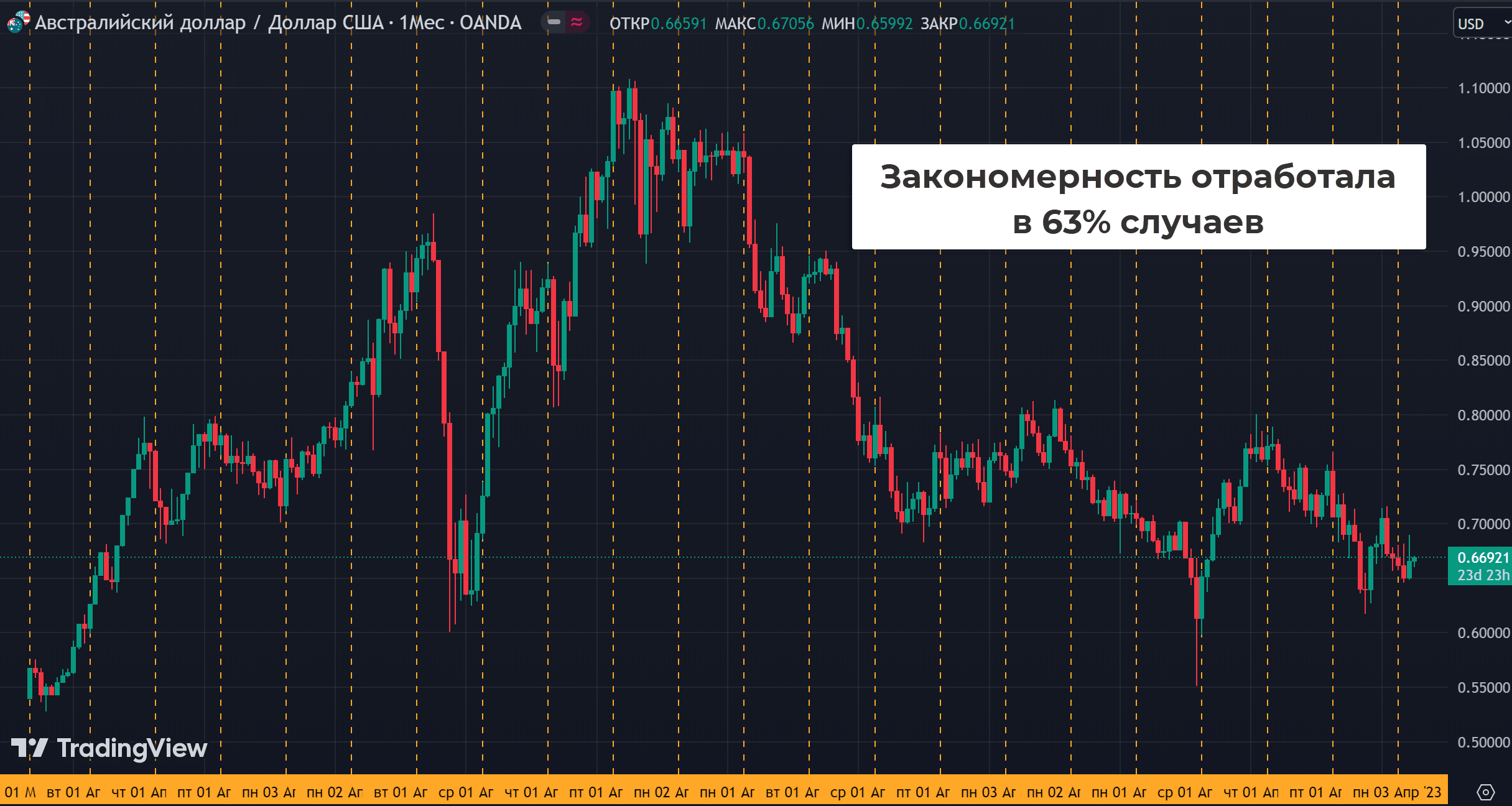 - Австралия и Новая Зеландия. В апреле-мае, как правило, наблюдается лучший торговый баланс, это бычий фактор для валют этих стран. В теории в апреле и возможно мае чаще должен наблюдаться рост обеих валют в паре с американцем и другими валютами. Эта закономерность практически идеально отрабатывала до начала десятых годов, затем все чаще стали происходит сбои. На дистанции в 22 года отработка сценария происходила в 63% случаев.