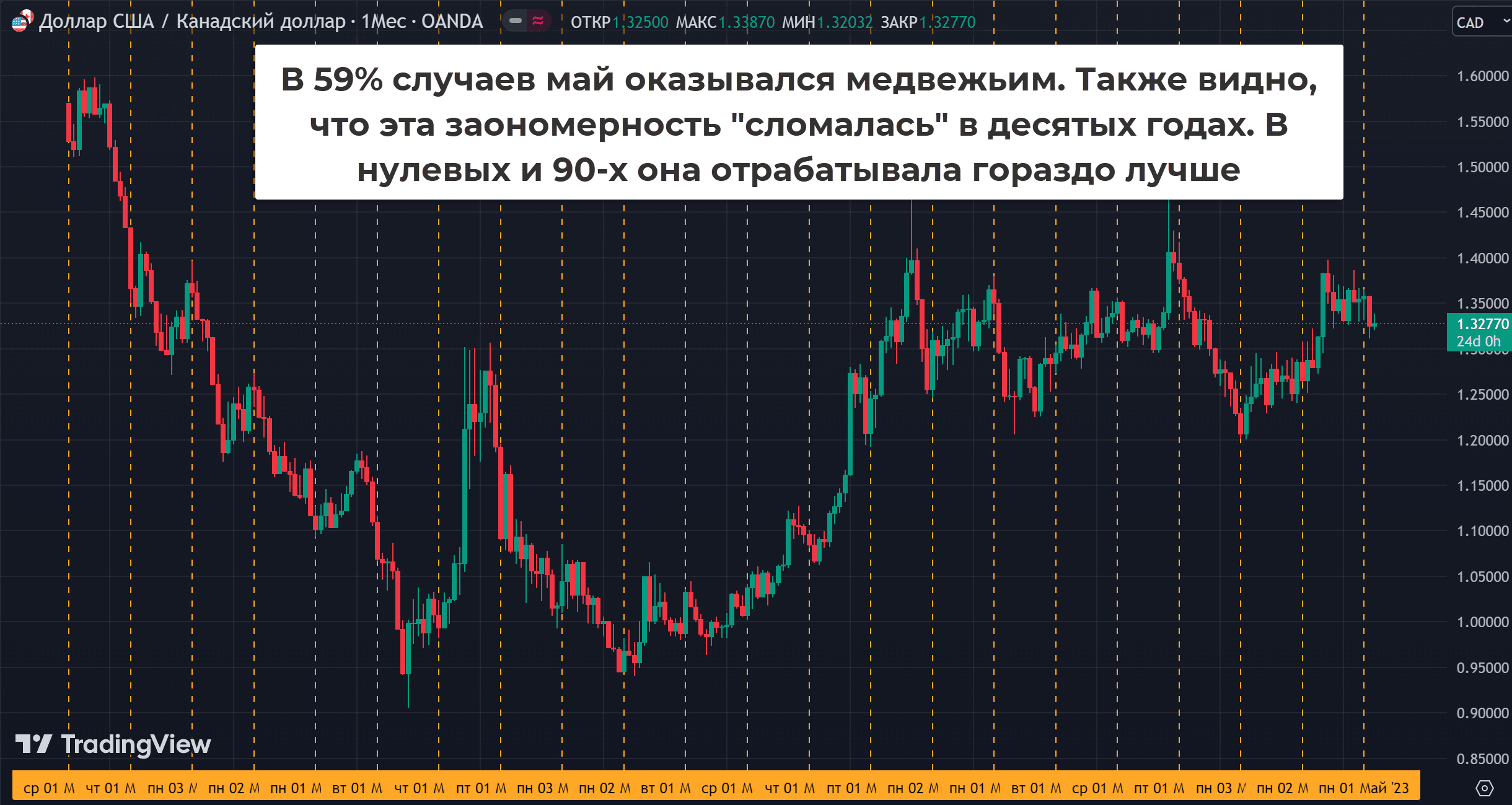 - Сырьевые валюты, зависящие, например, от цены нефти/газа, в большей степени привязаны к временам года. После отопительного периода стоимость углеводородов падает, это может ослабить соответствующую валюту. Один из примеров – цена нефти и поведение канадского доллара в мае. В прошлом именно май обычно становился медвежьим месяцев для канадца. Отличался диапазон свечи, размер теней с обеих сторон, но чаще всего в мае канадский доллар дешевел в паре с USD.