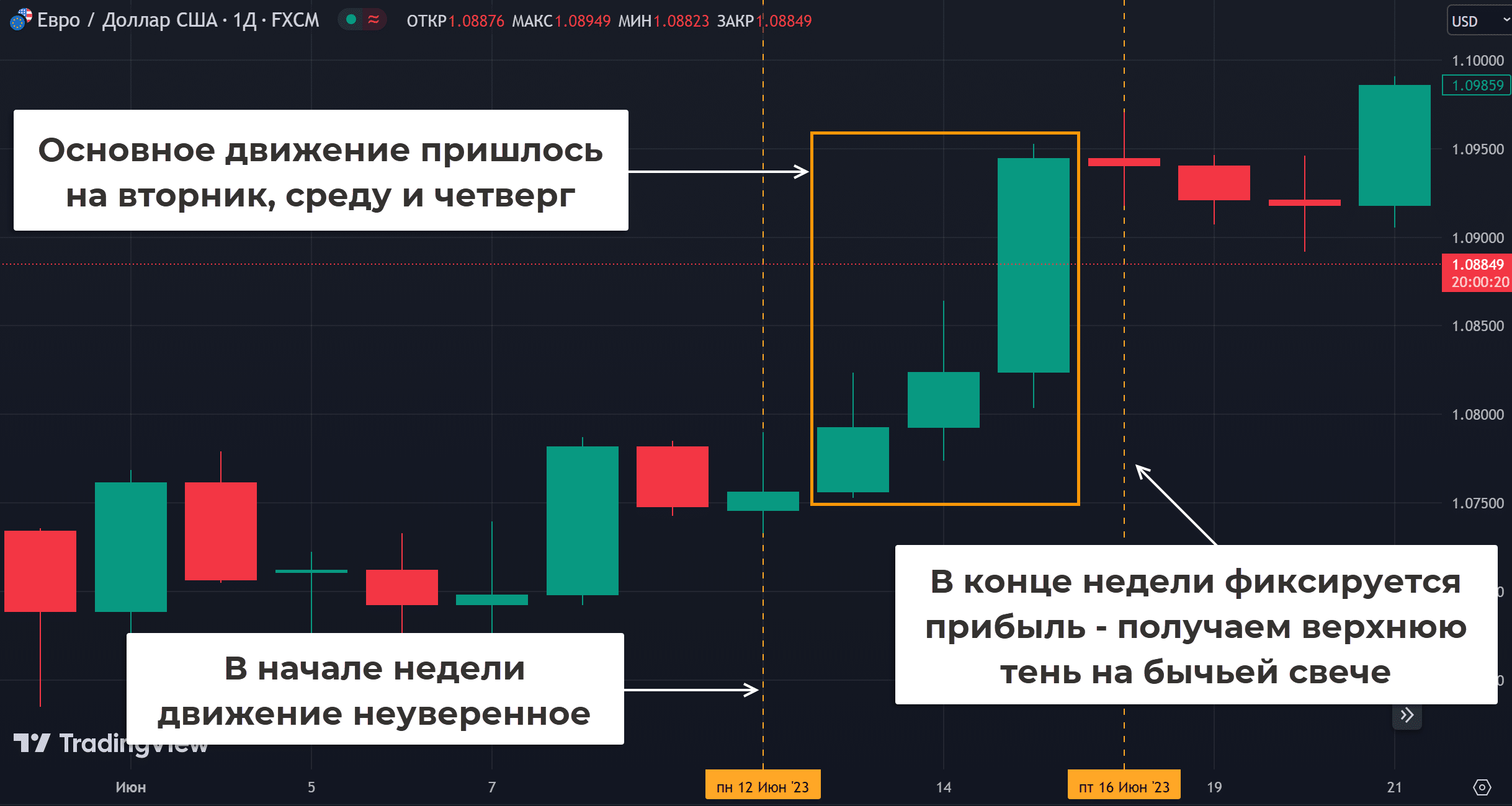 - Понедельник. На открытии недели может формироваться фитиль недельной свечи, он направлен в сторону, противоположную основному движению. Если рынок растет, то формируется нижняя тень бычьей свечки и наоборот.