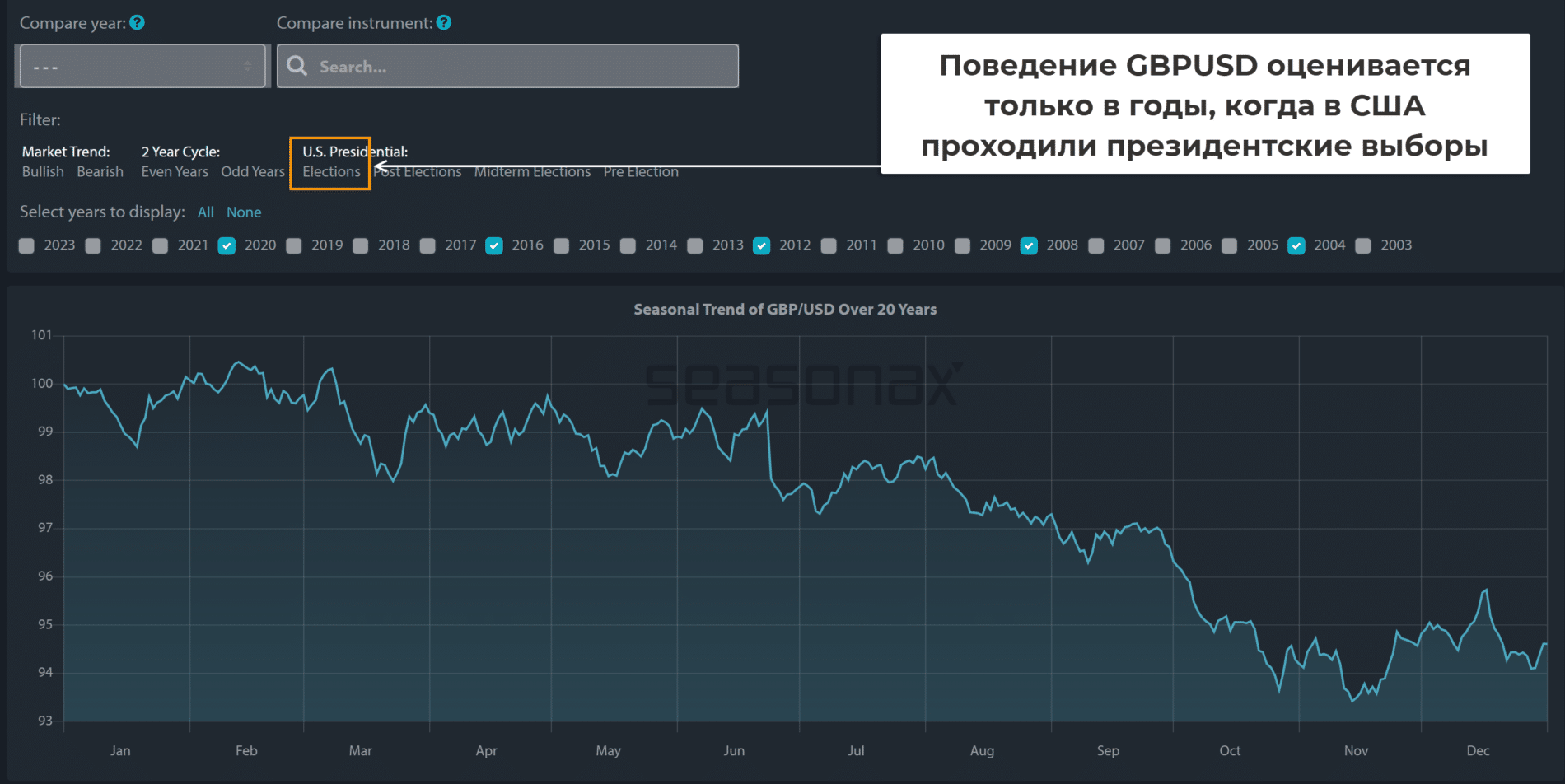 Помимо чисел важна оценка графика сезонного тренда. В случае с GBPUSD и анализом истории за последние 10 лет можно выделить пару закономерностей: