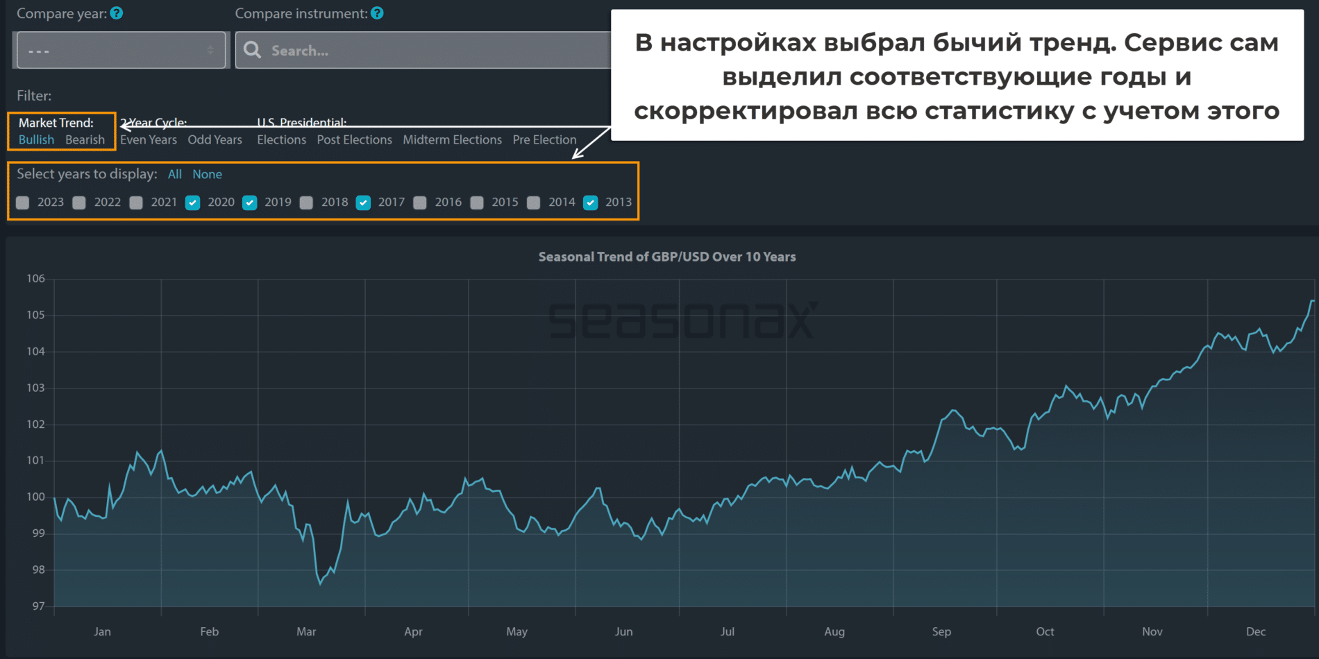 - Возможность выделения бычьих и медвежьих лет. При соответствующем выборе сервис сам выдели трендовые годы на истории и выдаст статистику с учетом только этих лет. Подходит для ситуаций, когда вы столкнулись с явно выраженным трендом и нужно оценить поведение актива только на трендовых отрезках истории.