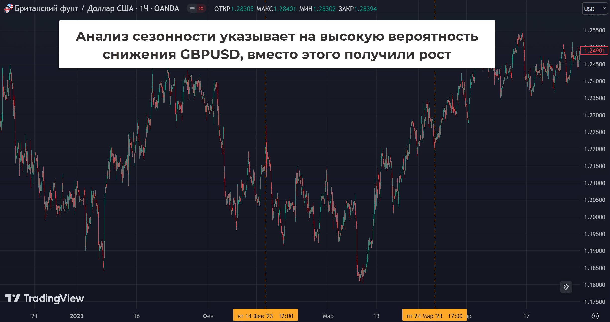 Все перечисленное выше можно увидеть на реальном графике GBPUSD. Например, в 2023 г. поведение британца на отрезке истории с апреля по июнь соответствует результатам анализа GBPUSD с помощью Seasonax. Наблюдался флет с тенденцией к незначительному укреплению фунта.