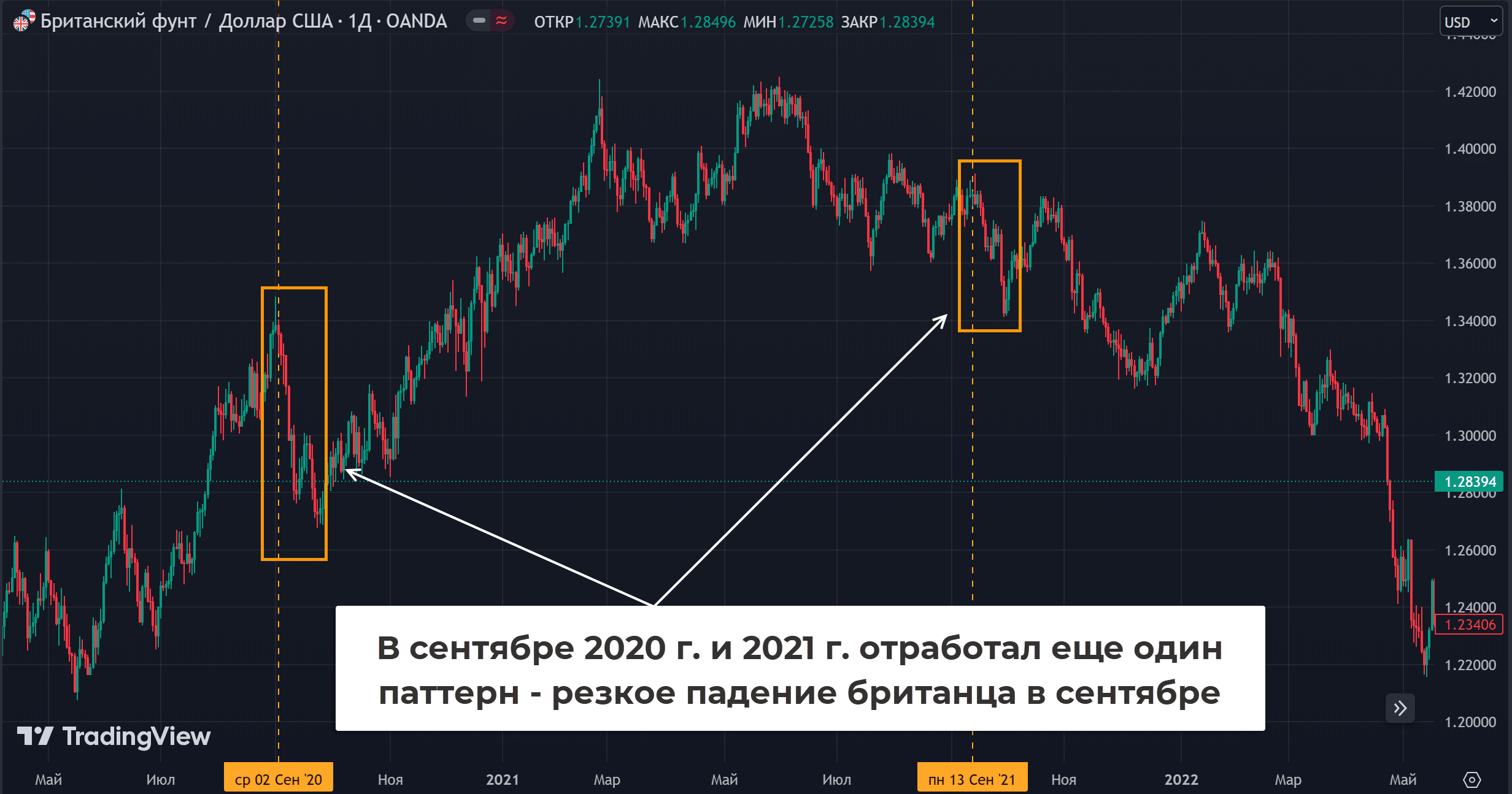 В 2020 г. и 2021 г. отработал паттерн, связанный с резким падением GBP в сентябре – начале октября. Еще перед непосредственным снижением котировок можно было предвидеть ослабление британца с помощью Seasonax.