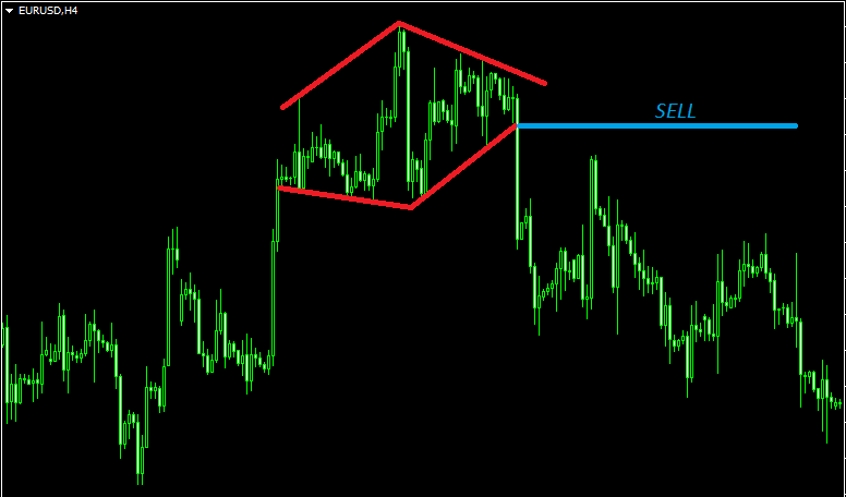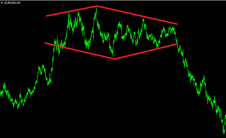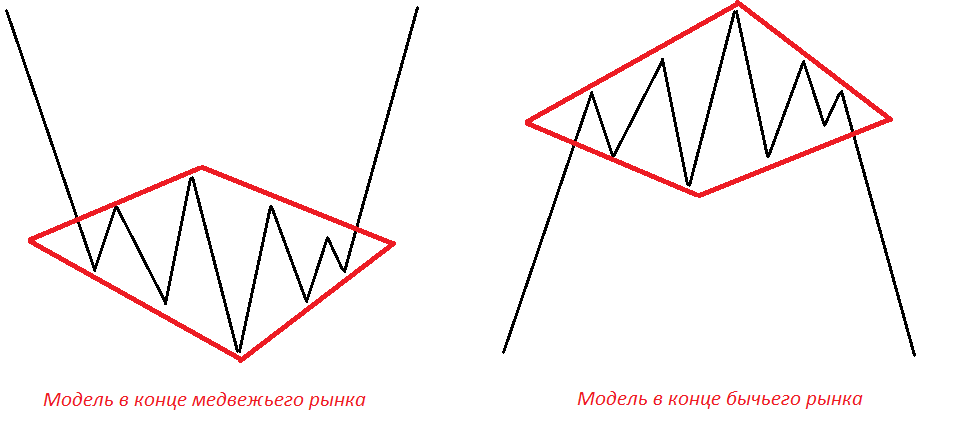 Самое важное – это внешний вид движения, если оно соответствует описанию, то практически точно далее будет происходить третья фаза формирования паттерна, которая подаёт сигнал к необходимости готовиться ко входу в рынок. Также бывает, что движений не 1, а 2, то есть второе практически идентично первому как по интенсивности, так и по размеру. - Сужающаяся формация, то есть, противоположность первому. По сути это всем привычный обыкновенный треугольник, каких на графике можно встретить очень много. Обычно состоит из 5 движений, но может быть и больше. В целом, это не так уж важно, главное, чтобы сохранялась последовательность и такая специфическая для рынка форма графика. В итоге получается ромб, центральное движение которого будет общей гранью для 2-х треугольников – расширяющегося и сужающегося.