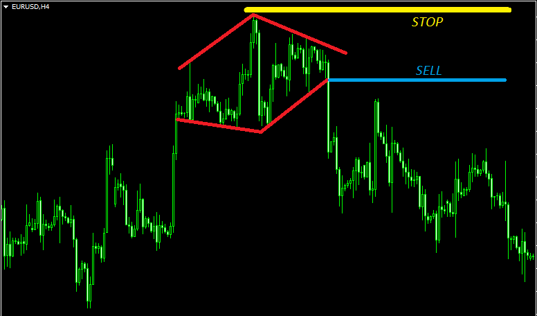 - После этого проводится образующая линия, которая и станет сигнальным уровнем. В некоторой степени она может напоминать трендовую линию, торговля по ней полностью соответствует торговле на пробой трендовой. То есть мы ждём пока цена закрепится под линией – должна закрыться свеча тайм фрейма, на котором формируется сама фигура алмаз. Но здесь есть один важный нюанс – этот разворотный паттерн иногда начинает очень резко отрабатываться в сторону нового тренда и ждать закрытия свечи попросту нет смысла, можно упустить значительную часть движения.