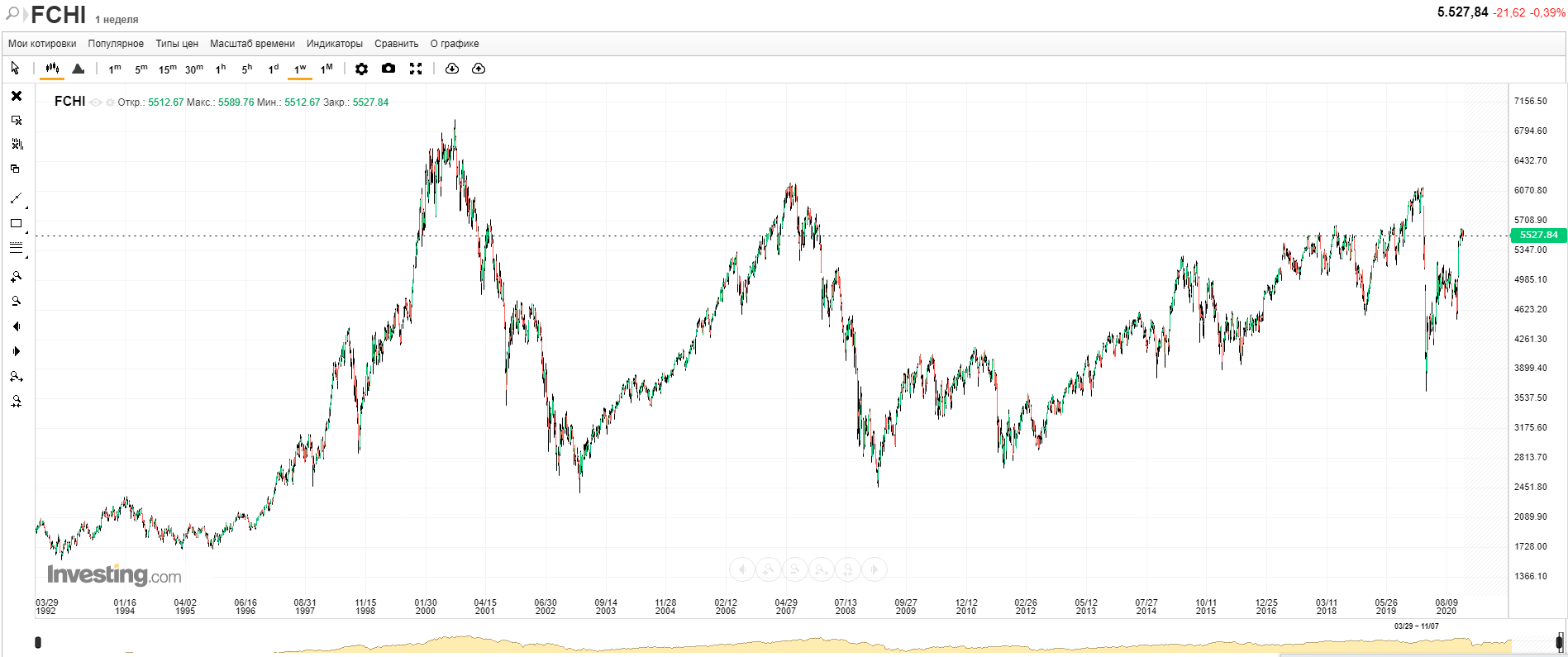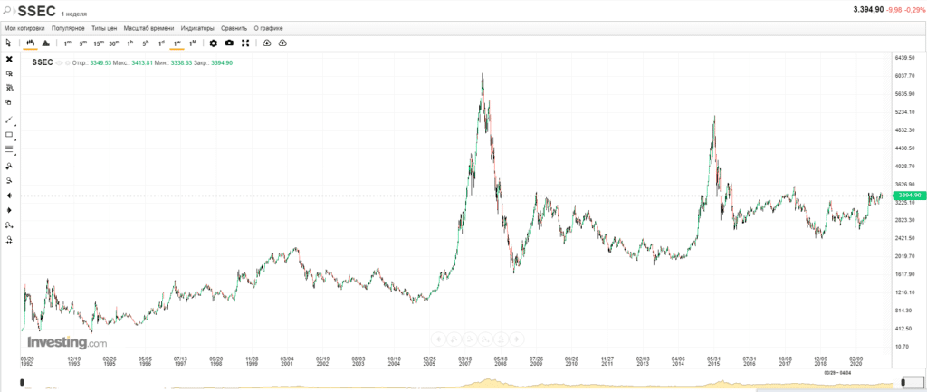 - Shanghai Composite – основной инструмент при анализе китайского рынка. В истории было 2 резких взлета Shanghai Composite, но затем следовало столь же резкое падение. Shanghai Composite до сих пор не достиг уровней, на которых SSEC находился перед мировым финансовым кризисом в 2008 году.