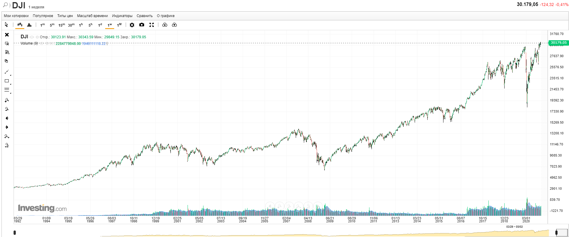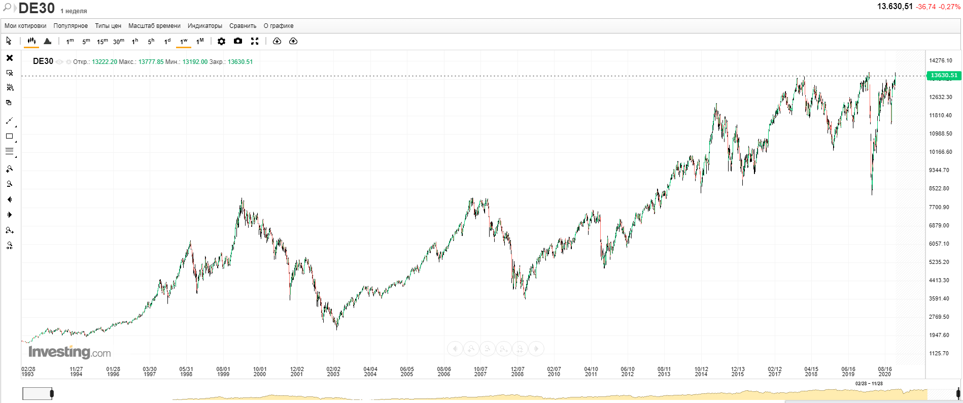 - Deutscher Aktien Index (DAX). Барометр немецкого фондового рынка, как и Dow 30 состоит из акций 30 крупнейших немецких компаний. Германия – локомотив экономики Европейского Союза, так что DAX пользуется популярностью у трейдеров и инвесторов. Динамика схожа с S&P 500, на дистанции индекс растет, но во время кризисов наблюдаются глубокие коррекционные движения. Например, на то, чтобы обновить максимум, достигнутый перед крахом доткомов, ушло больше 10 лет.