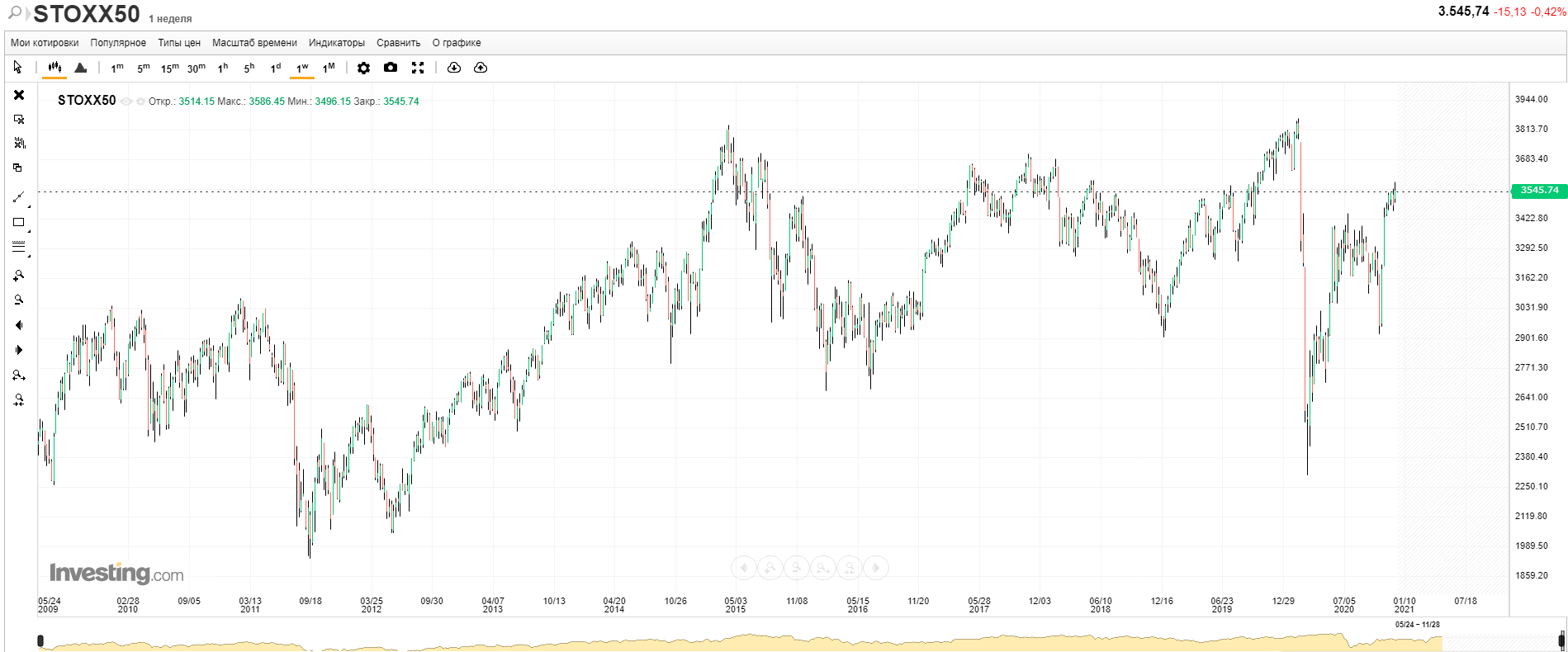 - Euro Stoxx 50. Еще один общеевропейский индекс, включающий 50 компаний из 19 отраслей экономики. Как и в случае с Euronext 100 ведущую роль играют немецкие и французские компании. Явно выраженный бычий тренд отсутствует, больше 10 лет график Euro Stoxx 50 движется в широком диапазоне.