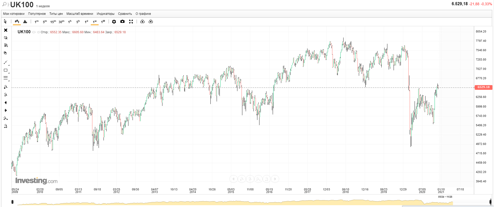 - FTSE 100 – полезен при анализе состояния экономики Великобритании. Название указывает на количество акций в корзине, отбираются только крупнейшие компании, поэтому корзина FTSE 100 соответствует примерно 80% капитализации London Stock Exchange. Ранее наблюдалась высокая связь FTSE 100 с европейскими индексами, после Брекзита эта связь может нарушиться. FTSE 100 – один из крупнейших индексов, так и не восстановившихся до конца 2020 г. от падения, спровоцированного пандемией коронавируса.