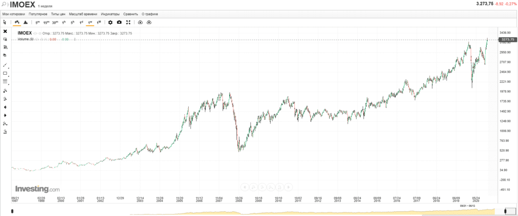 - IMOEX – до 2017 г. имел название индекс ММВБ, в него входят все голубые фишки российского рынка. Из-за особенностей российской экономики ведущее положение в корзине занимают представители нефтегазового сектора, далее идут финучреждения. Ввиду неплохой волатильности подходит для активной торговли, фьючерсы на него обращаются на Московской бирже. Несмотря на санкционное давление на Россию и неопределенность в отношении цен на углеводороды индекс растет в долгосрочной перспктиве. Причина стабильного роста кроется в том, что он рассчитывается в рублях, а не в долларах.