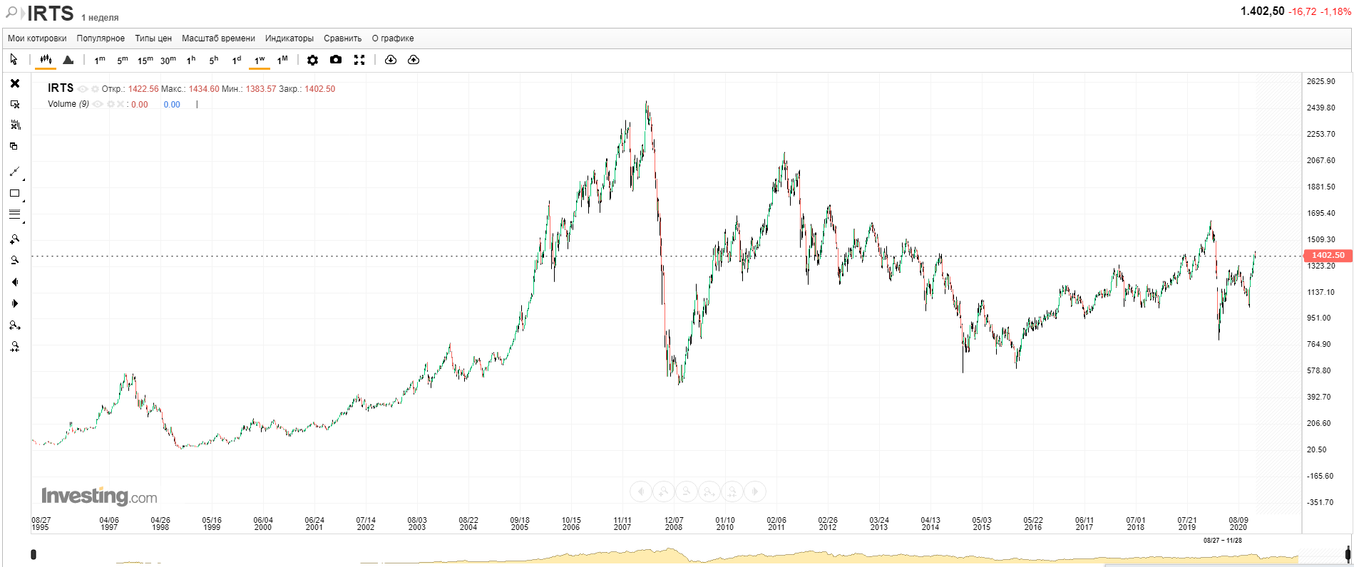 - IRTS – еще один барометр российского рынка, его также рассчитывает ММВБ. Корзина состоит из 50 компаний, ведущую роль играют компании, работающие в нефтегазовой отрасли. В отличие от IMOEX расчеты ведутся в долларах, поэтому на дистанции РТС не растет, динамика рублевой версии РТС совпадает с IMOEX.