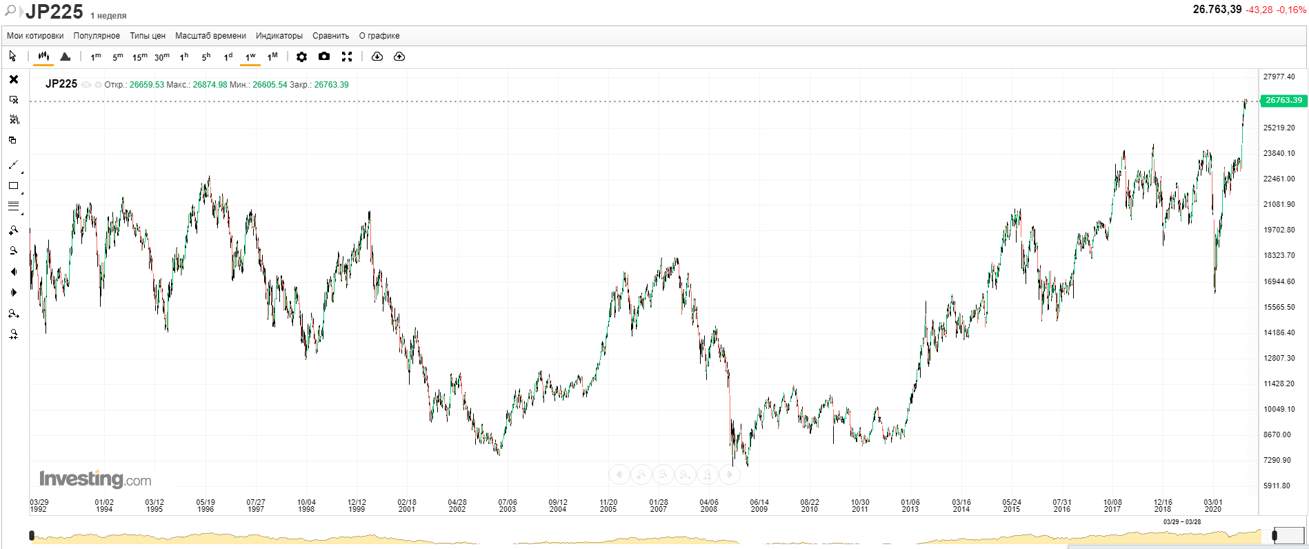 - Nikkei 225, считается основным барометром японского рынка. Число в названии указывает на количество компонентов в корзине. До 2010 г. Nikkei 225планомерно снижался с продолжительными восходящими коррекциями. Затем ситуация изменилась и за промежуток с 2010 г. по 2020 г. вырос в 3+ раза. Япония очень уверенно прошла испытание коронавирусом, что стимулировало рост японского рынка. В конце 2020 г. Nikkei 225 штурмует исторические максимумы.