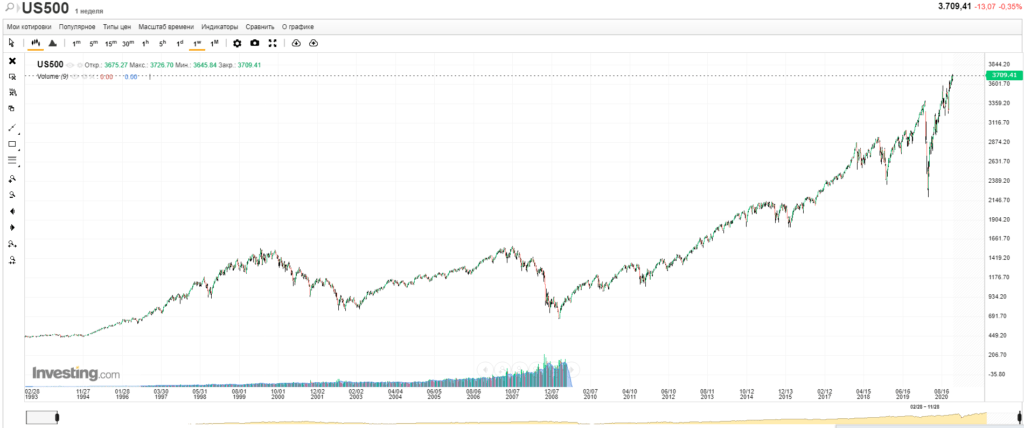 - S&P 500. Характеризует рынок США, корзина состоит из 500 голубых фишек. О масштабах биржевого индекса говорит то, что капитализация корзины соответствует примерно 80% всего рынка США. На основе индекса созданы десятки инвестпродуктов, самый известный – ETF фонд с тикером SPY, работает с 1993 г. График S&P 500 уходит в просадку во время кризисов, но на дистанции уверенно растет, за это и ценится инвесторами. Инвестпродукты, созданные на его основе подходят для долгосрочного инвестирования.