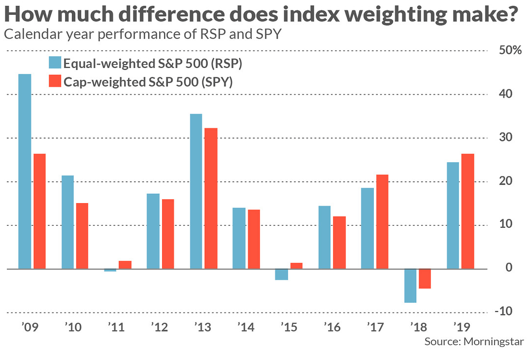 - Равные «веса» всех компонентов. Не учитывается ни стоимость бумаг, ни капитализация, «вес» компонента рассчитывается как 1/n, где n – количество бумаг в корзине. Занижается роль лидеров индустрии, при этом завышается влияние компаний с относительно малой капитализацией. По сравнению с market cap и free—float cap равновесные индексы обладают повышенной волатильностью и меньшей ликвидностью. Один и тот же индекс может рассчитываться в обычной и равновесной вариациях, например, у S&P 500 есть equal weight версия.