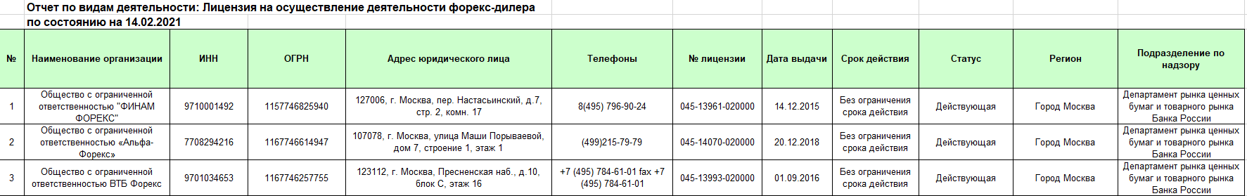 В России ранее только 4 брокера имели лицензии ЦБ РФ. Но 22 декабря 2020 г. по заявлению ПСБ Форекс регулятор прекратил действие лицензии этой компании. По состоянию на февраль 2021 г. в РФ только 3 компании имеют лицензию госрегулятора.