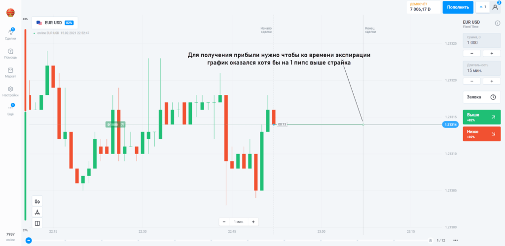 - Размер прибыли зависит только от стоимости опциона (размера ставки). Что касается пройденного ценой расстояния, то важно лишь чтобы график оказался над или под ценой страйк. Под страйком понимается уровень, на котором трейдер входил в рынок.