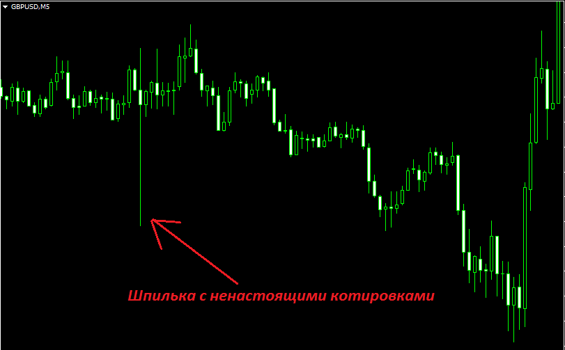 - Шпильки. Это классика старых форекс кухонь. На графике вдруг появляется свеча с длинной тенью, то есть котировки, которых в реальности не было. Подразумевается, что цена резко сходила вниз, потом вернулась наверх, либо наоборот. Что получается – сбор стоп приказов. То есть убытки клиентов, которые стали доходом брокера. В какой момент будет шпилька не предугадать, это зависит от того, где сосредоточены стопы и тейки. Кухне надо сделать так, чтобы собрать стопы и не дать сработать тейкам.