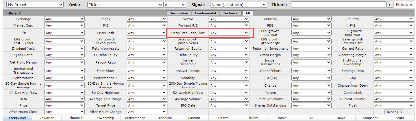 - Finviz. Здесь есть неплохой бесплатный скринер, по каждой из 8000+ компаний можно узнать значения нескольких десятков мультипликаторов. FCF нет, но доступен производный показатель Price to Free Cash Flow.
