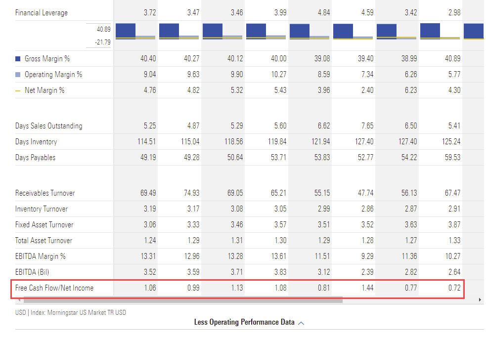 - Morningstar. Мультипликатор отдельно не рассчитывается, вместо этого в разделе «Operating Performance» приводится значение производного показателя FCF/Net Income.
