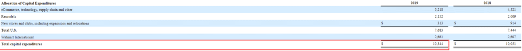 - Capital expenditures – $10,344 млрд. В отчетности есть данные по нескольким подразделениям Walmart, нас интересует общее значение капитальных расходов, то есть Total capital expenditures.