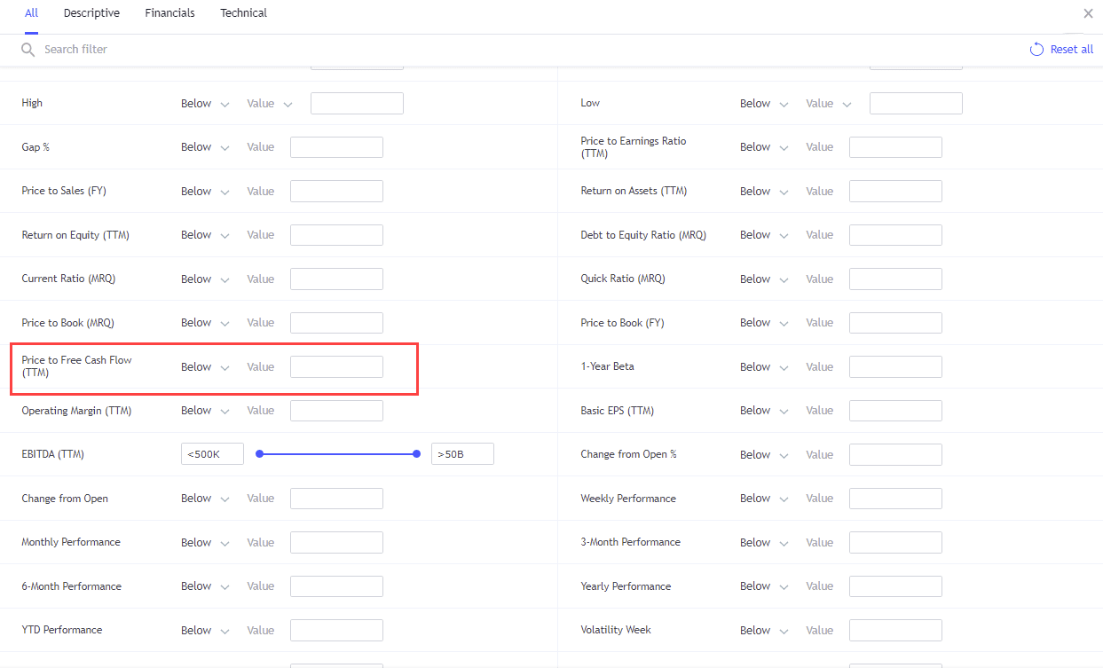 - TradingView. По возможностям местный скринер как минимум не уступает аналогу от Finviz. В перечне фильтров есть только Price to FCF, можно задавать различные условия фильтрации.