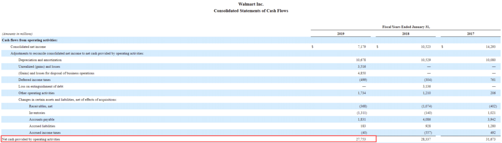 - В отчете находим строку «Net cash provided by operating activities», это и есть Operating Cash Flow. В нашем примере для Walmart в 2019 г. этот показатель был равен $27,753 млрд.