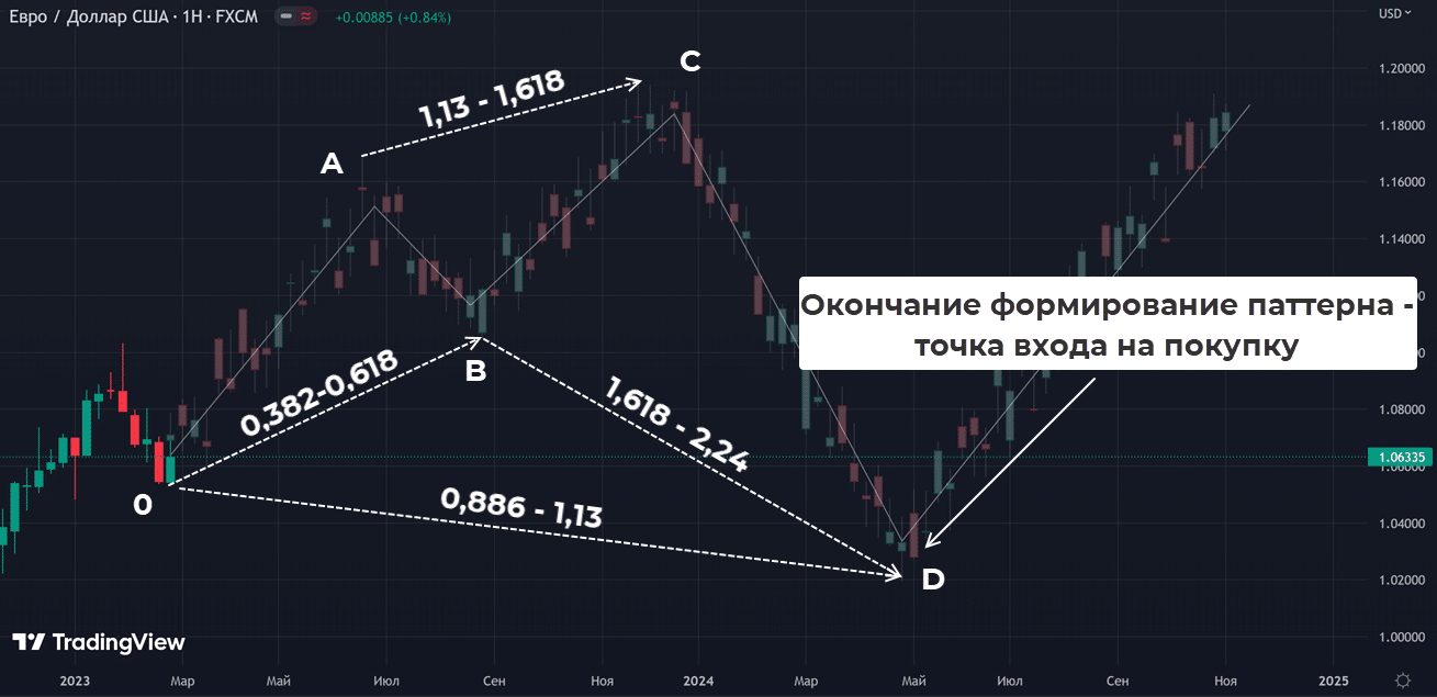 - Пятая точка (обозначена как D на схеме ниже) появляется перед продолжением роста, это дно и отличная возможность для покупок.