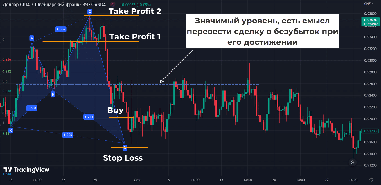 В рынок можно входить после того, как график вошел в зону уровней 88,6%-113% от движения X—A и в ней появилась свеча с большой тенью сверху. Это намек на то, что быки пробуют перейти в наступление.