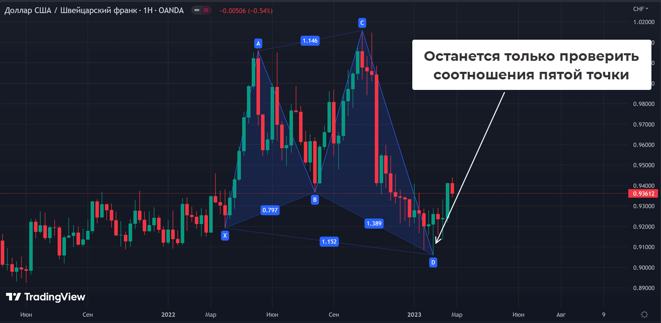 Основное неудобство при работе по гармоническим паттернам – ручная разметка с оценкой нужных соотношений между элементами фигуры. В TradingView есть инструмент, облегчающий построения. Используя шаблон XABCD, можно быстро выделить подходящую пятиточечную структуру и получить Фибо соотношения между ее элементами.