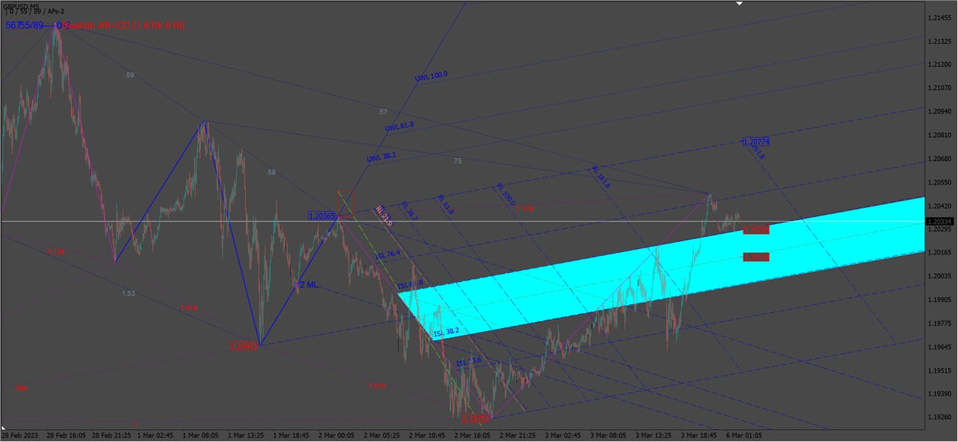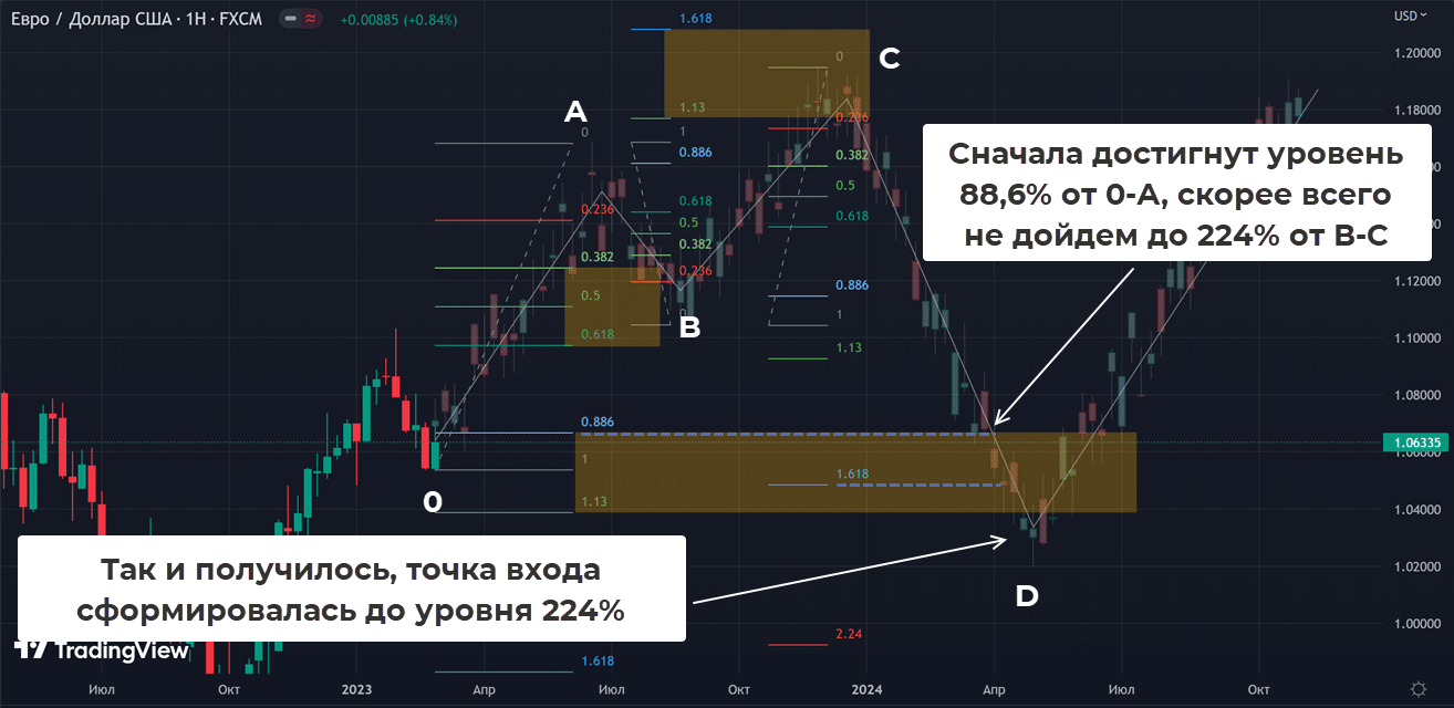 Когда вы видите, что основные соотношения между отдельными волнами выполнены и сейчас развивается движение C—D, то нужно дождаться входа графика в диапазон между соответствующими Фибо-уровнями. С этого момента трейдер следит за появлением разворотных сигналов. Если наблюдается явная попытка разворота, то можно пробовать торговать.