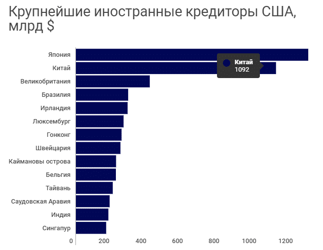 Ключевой аргумент тех, кто предрекает скорый крах доллара и США в целом – возможность крупнейших держателей госдолга потребовать его одномоментный возврат. По состоянию на лето 2020 г. крупнейшими кредиторами Америки является Япония ($1,268 млрд) и Китай ($1,092 млрд). И если с Японией отношения у США неплохие, то с Китаем они постоянно ухудшаются.