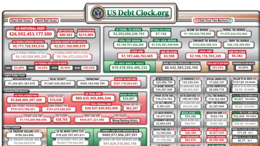 Что касается текущего размера задолженности в долларах, то есть масса онлайн-калькуляторов, рассчитывающих этот показатель. В США есть даже специальные табло, в которых подсчет идет круглосуточно.