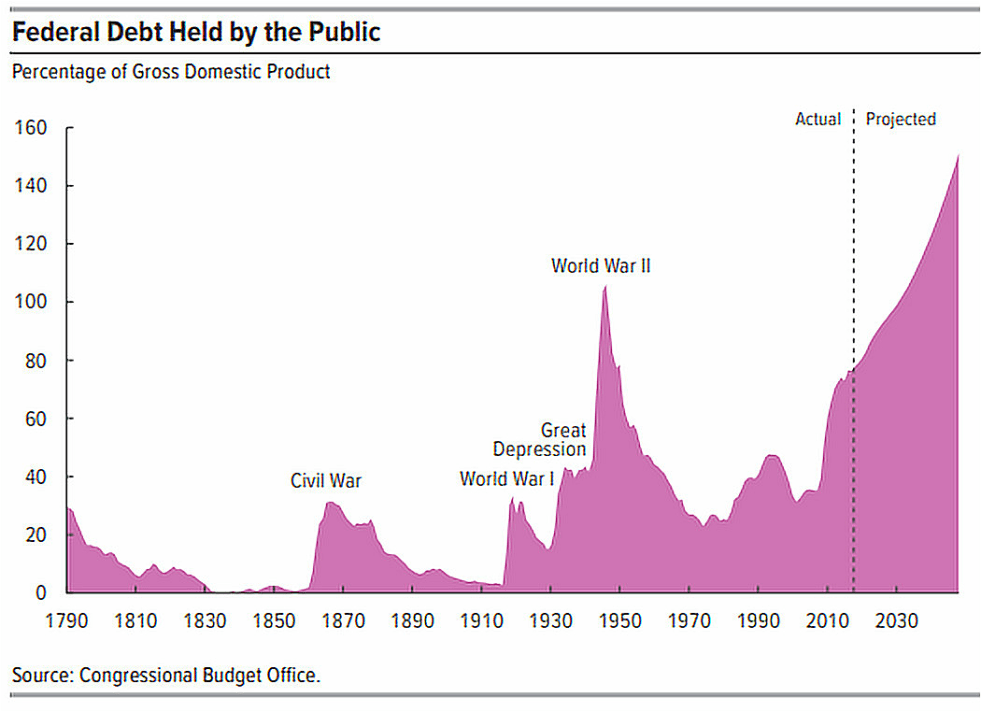 - 18 сентября 1789 г. – Александр Гамильтон выпускает первые казначейские облигации. Это был вынужденный шаг, тогда шла война за независимость и облигации позволили привлечь капитал для финансирования военных действий. В итоге задолженность составила треть ВВП или $75 млн, порядка $900 млн в наше время;