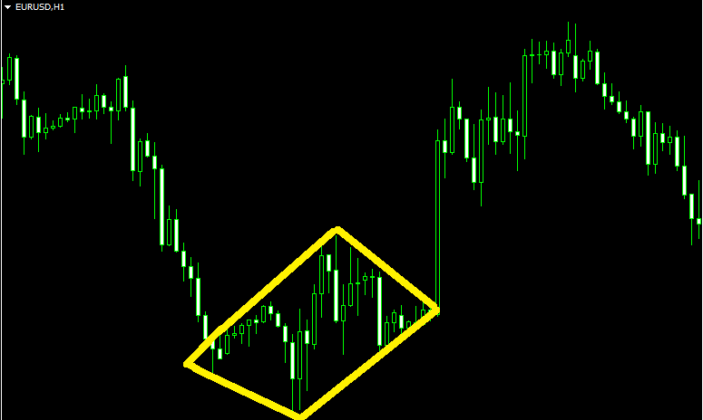 Вход в рынок осуществляется при прорыве одной из границ ромба. Поскольку сам паттерн мы рассматриваем как разворотный, то и торгуем после прорыва диапазона в нужном нам направлении. Однако, бывают случаи, когда столь же резкое движение после формирования паттерна происходит не в обратном тренду направлении, а по нему. Обычно так бывает на совсем малых тайм фреймах – М5 и М1. Поэтому, лучше ориентироваться на среднесрочный вариант.