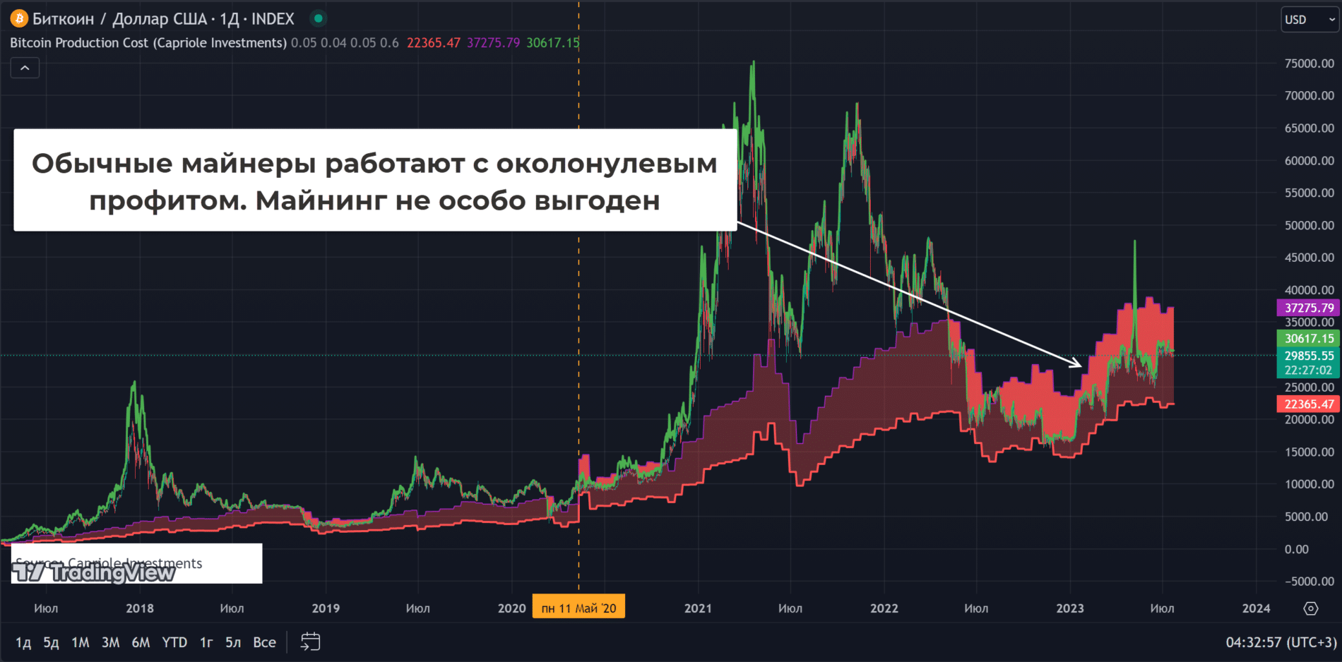В прошлом эта зона всегда выступала в роли поддержки. Сейчас наблюдаем тест этой зоны, после halving вероятен рост и восстановление доходности майнеров.