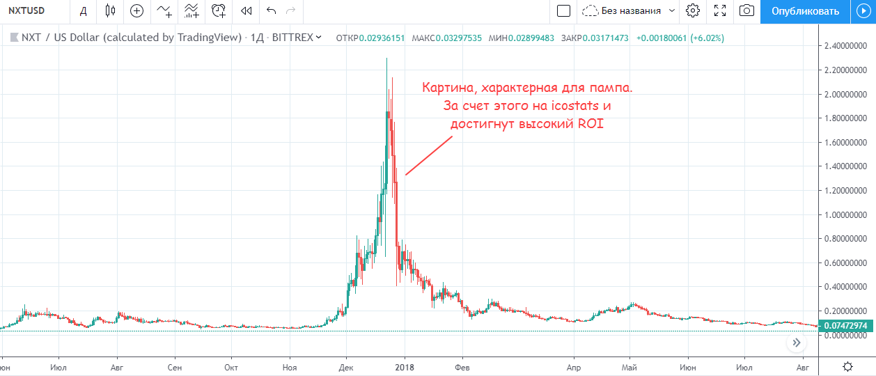 Например, в случае с лидирующим NXT наблюдаем картину, характерную для пампа и дампа. Резкий взлет монеты и такое же резкое падение. Тот же Эфириум хотя и не занимает первое место по ROI, но куда популярнее NXT.