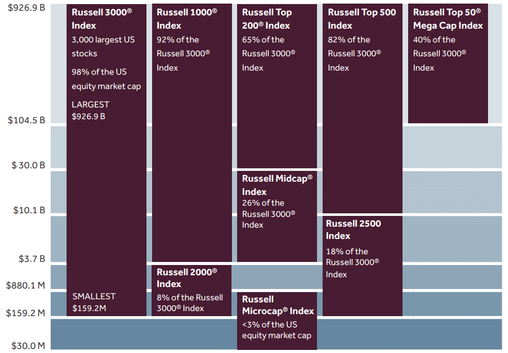О масштабах компаний, входящих в состав обоих индексов можно судить по данным провайдера. Так, в состав Расселл 2000 входит 2/3 компаний из старшего индекса, но при этом его капитализация составляет до 10% от капитализации Russell 3000. На базе старшей версии созданы и другие подиндексы от Расселл.