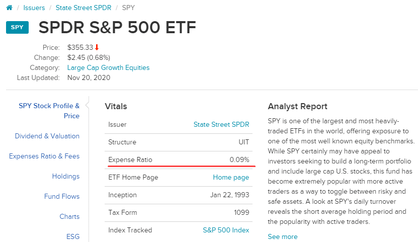 Самый известный ETF – фонд с тикером SPY, он работает с 1993 г., каждая его акция соответствует всей корзине S&P 500. То есть купив 1 бумагу SPY инвестор вкладывает деньги во все американские компании, дающие порядка 80% капитализации американского фондового рынка. За счет 1 сделки делается то же самое, что и при первом подходе с ручным составлением портфеля.