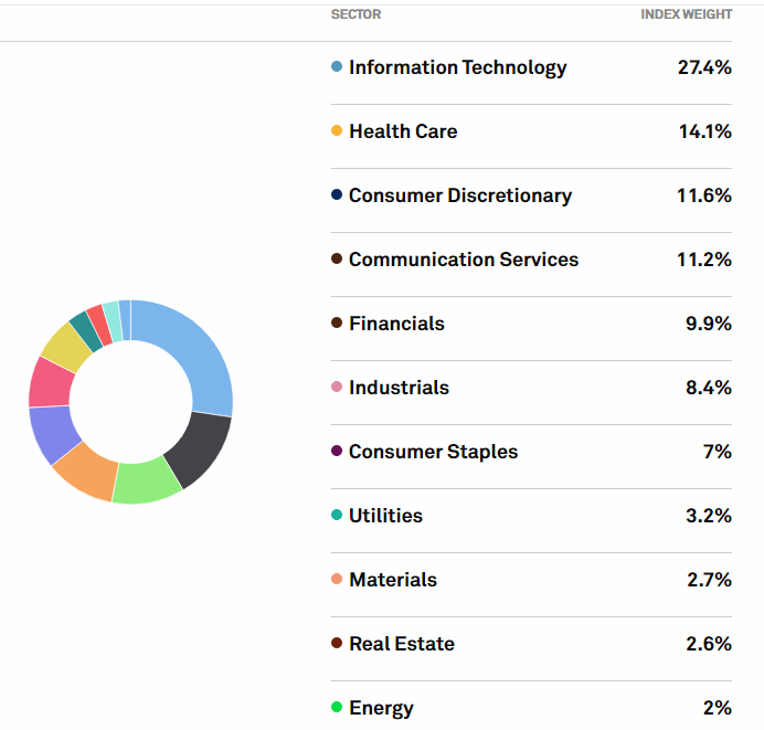 Одна из особенностей индекса СНП 500 – неравномерное распределение между сферами экономики. Жестких секторальных ограничений нет, поэтому, например, IT-сфера занимает 27,4%. Всего же на IT и здравоохранение приходится более 40% «веса». Индекс критикуют за это, отсутствие ограничений по секторам экономики приводит к тому, что S&P 500 в разные периоды истории был сильно зависим от финансовой составляющей, позже – от IT-сферы и отрасли здравоохранения.