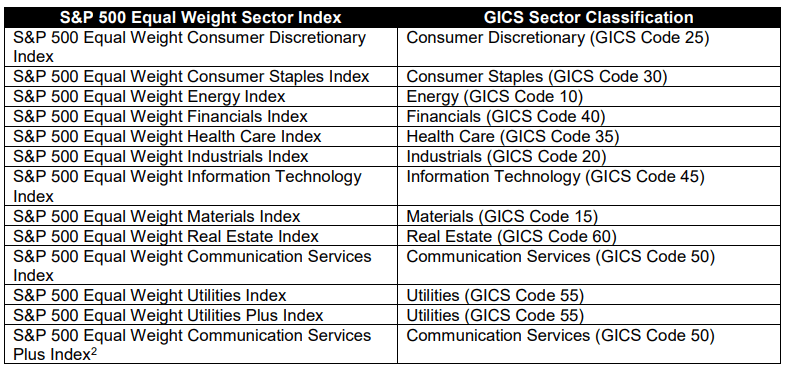 - S&P 500 Ex-Sector Indices. Из корзины обычного S&P 500 удаляются компании, относящиеся к определенному сектору в соответствии с классификатором GICS. На основе котировок оставшихся бумаг рассчитывается значение Ex—Sector Indices;