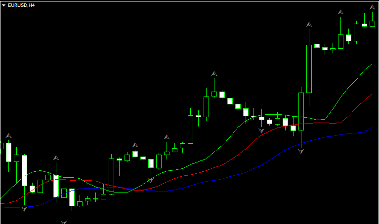 - Губы. Это самая быстрая из входящих в состав индикатора скользящая средняя, которая имеет период 5. На такой период приходится менее суток, поэтому она очень быстро начинает двигаться по сравнению с предыдущими двумя мувингами. Также имеет ещё меньший сдвиг, который составляет 3 бара. Обозначается линией красного цвета.