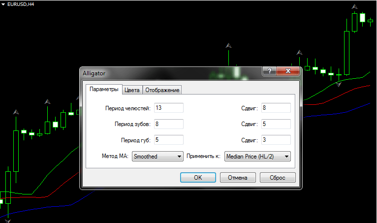 Если всё выше сказанное не убедит в работоспособности индикатора Аллигатор, то тогда нужно просто наложить его четырёхчасовой график и посмотреть, насколько он действительно эффективно всё показывает. В списке индикаторов выбираем категорию “Билла Вильямса” и уже в ней нажимаем на индикатор Alligator. Появится окошко с настройками: