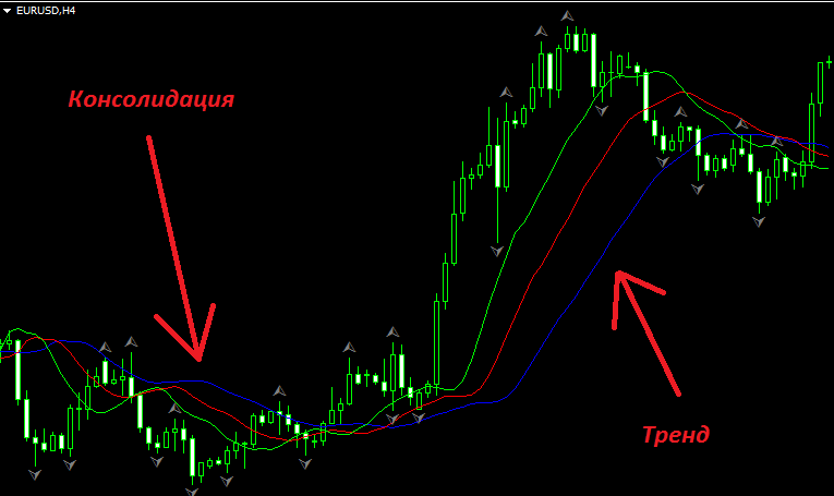 Учитывая, что линии не только имеют разные периоды, но также и сдвинуты по-разному, можно оценивать всё в разных масштабах. Уход цены от медленной говорит о значительном изменении относительно продолжительного времени. Средняя линия покажет среднесрочную перспективу в рамках тренда и его фаз, а быстрая линия показывает достаточно краткосрочные изменения динамики и действия участников рынка. В общем, достаточно удобная и крайне информативная диверсификация анализа движения и фаз. Теперь перейдём к рассмотрению самой структуры сигналов и того, как это интерпретировать, а также варианты торговли по индикатору Аллигатор.