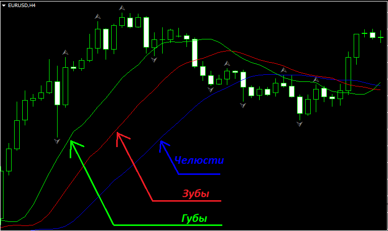 Итак, основа всей торговли – это расхождение скользящих средних. Как только диапазон между ними начинает увеличиваться, на рынке появляется тренд. Они располагаются на удалении от цены в порядке возрастания периода, то есть ближе всего к цене губы, затем зубы и последняя линия – пасть, то есть, чем больше период, тем дальше располагается линия.