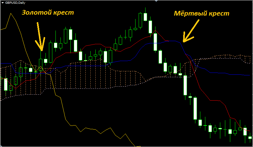 - “золотой крест”. В этом случае Тенкан пересекает Киджун снизу вверх, то есть сигнал на разворот вверх и развитие бычьего тренда.